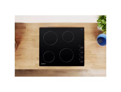 The Indesit RI860C Electric Ceramic Hob is a 58cm wide electric hob with lateral dial controls and four cooking zones. It features an electric power supply with 6 power levels.