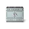 The La Cornue CornuFé 110cm Dual Fuel Polished Chrome Roquefort features two large electric convection ovens, one of which has seven unique cooking modes. It has five brass gas burners and a central burner with 4 kW of power. The CornuFé 110cm Polished Chrome Roquefort range features French side-swing enamelled steel doors.
