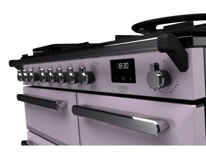 Inspired by retro design with clean geometric lines and signature chamfered edges, the Estel Deluxe 100 offers both durability and practicality. Its chunky yet ergonomic control dials and handles enhance its nostalgic appeal while ensuring ease of use. Available in a selection of eight colours, including pastel hues and classic neutrals, this range cooker complements a variety of kitchen styles.