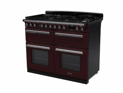 The Rangemaster ESDLB110DFPBOR/CM1 - 110cm Estel Deluxe Dual Fuel Bordeaux/Chrome Range Cooker 15251 blends timeless elegance with outstanding cooking performance, making it a refined and practical choice for any kitchen. Finished in a rich Bordeaux with chrome trim, this range cooker features signature chamfered edges, bold geometric lines, and ergonomic control dials, creating a look that is both classic and contemporary.