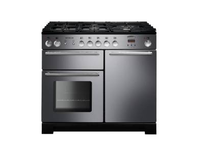 The Rangemaster INF100DFFSS Range Cooker has a straight-edged design with its stylish control and chrome trim.