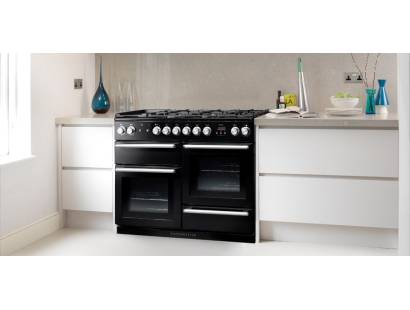 The Rangemaster NEX90DFFBLC 90cm Nexus Dual Fuel Black Chrome Range Cooker 104680 is a contemporary style range cooker delivering performance and a sleek design. This model boasts a range of new distinctive features, including the ultra modern rotary controls, improved grill with a deeper pan design. 3 button timer and plinth design branded Rangemaster. This model is A rated for energy efficiency and comes with a 2 year warranty.