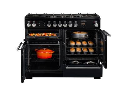 The Rangemaster INF110EIBL 110cm Range Cooker has a straight-edged design with its stylish controls and chrome trim.