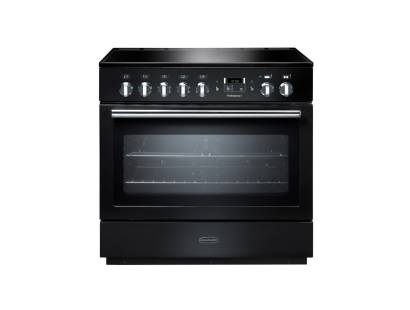 The Rangemaster PROP90FXEIGBC Black Chrome Range Cooker comes with a large multifunction oven with 7 functions - defrost, fan oven, fanned grilling, fan-assisted oven, conventional oven, browning element and base heat in both full oven and divided mode. The oven comes with a large, single triple-glazed door for easy viewing and there is a storage drawer large enough to fit the Energy Saving Panel and all the oven furniture when not in use. Full-width and half-width shelves are provided for use when the panel is and isn't used and the dual grill pan system offers safe grilling across full or half-oven width. The Rangemaster 96310 comes with a single-piece hotplate with five burners, and programmable clock and minute minder. When in place, the energy saving panel creates a spare cavity which acts as a handy plate warming facility. As with all new Rangemaster induction range cookers, this model comes with a new Catch-rite™ door fixture, Nite-Lite™ which automatically dims leaving a softer light in your kitchen after 10pm, SpillGuard™ technology and i5™ Induction.