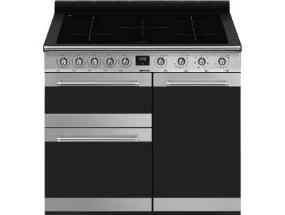 The Smeg SY103I - 100cm Symphony Induction Range Cooker is a three cavity cooker with two ovens, a grill compartment and a five zone induction hob. Both electric ovens are thermo-ventilated and benefit from a Vapor Clean system. The Smeg SY103I has a brushed steel finish with a black eclipse glass hob. Boasting an A/B energy class, the SY103I induction range cooker has a towel rail and touch timer display.