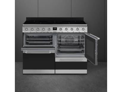 The Smeg SYD4110I-1 - 110cm Symphony Induction Range Cooker comes in a stainless steel and black eclipse glass finish. This four cavity cooker with three ovens, a five zone induction hob and a storage compartment. Complete with an A/A energy rating, the Smeg SYD4110I-1 induction range cooker offers both conventional and fan cooking.