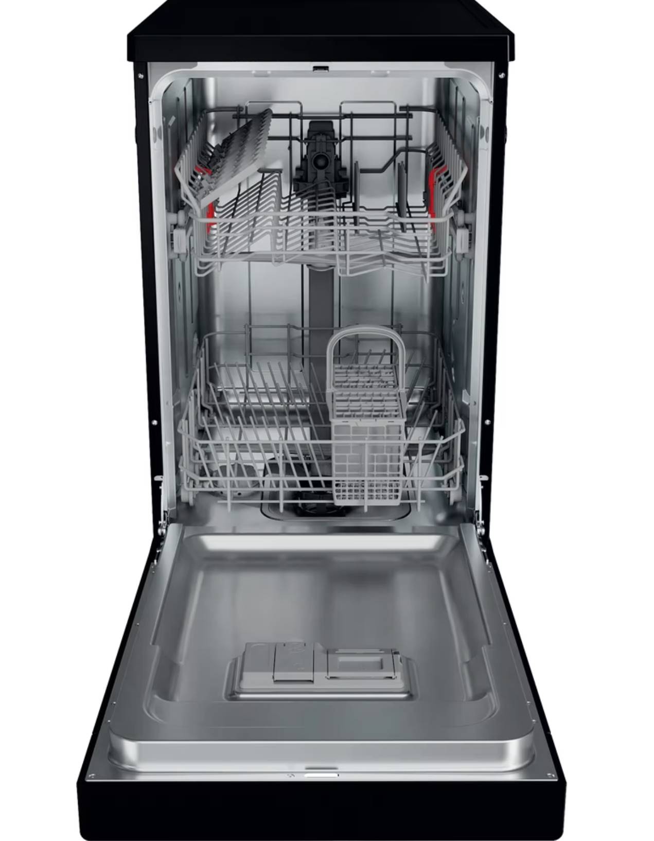 The Indesit DF9E1B10UK Slimline Dishwasher fits into a 45cm space, but can still handle up to washing 9 place settings. It features 6 programmes including Rapid 40 perfect when you're short on time. With the Delay Start option, you can control the start time of your cleaning. The Hotpoint DF9E1B10UK White Slimline Dishwasher features a stainless steel tub and an Auto Intensive programme.