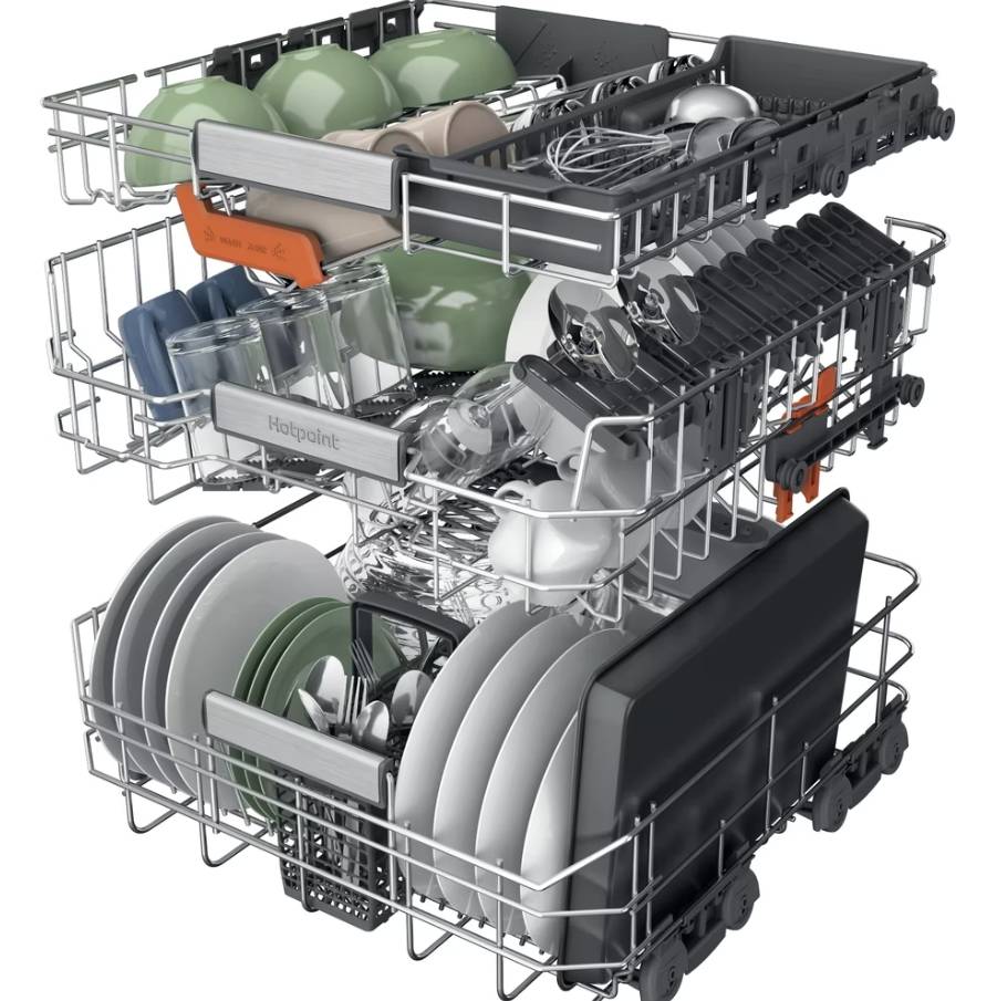 The Hotpoint H8IA115M4TUSUK built in dishwasher is designed to deliver powerful cleaning with maximum flexibility for busy households. With a generous 15 place setting capacity and an innovative Maxi Space tub, it offers more usable room than standard dishwashers, making it easier to load everything from plates and pans to mugs and small dishes. Featuring the advanced Hydroforce third rack with integrated spray jets, it provides exceptional cleaning coverage across all three levels.