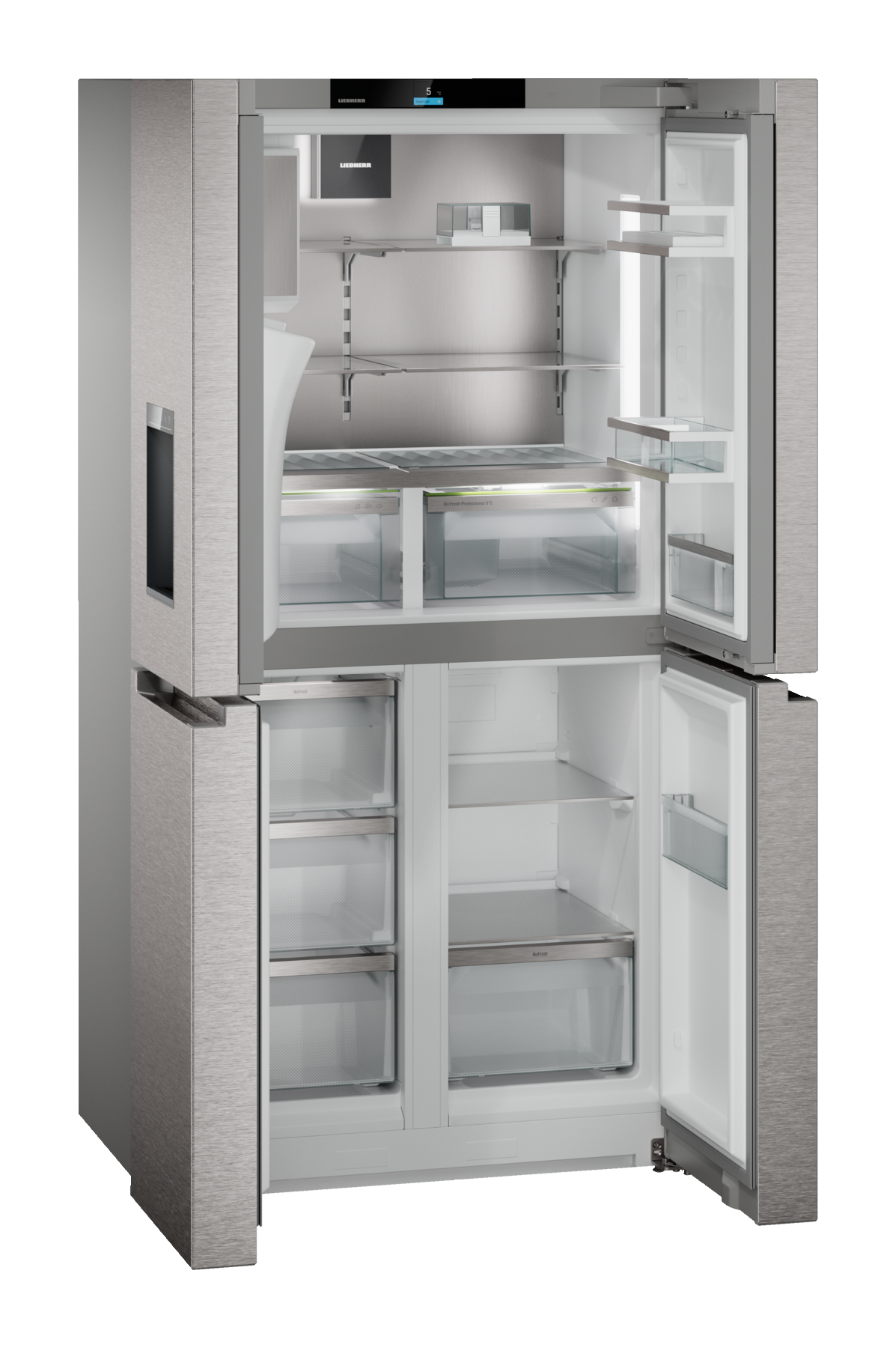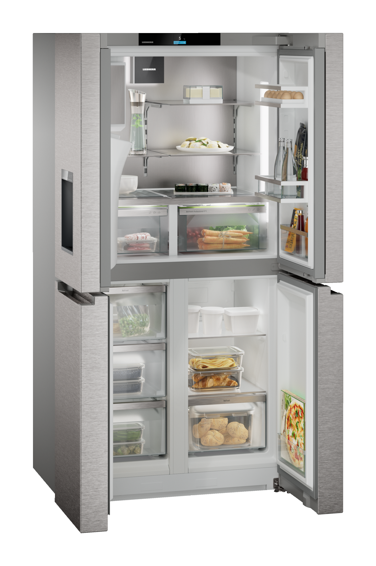The Liebherr MBsddi 9058 Four Door French Door Fridge Freezer combines striking design with cutting-edge refrigeration technology. Its 4-door French door layout offers effortless access to spacious compartments, while BioFresh Professional with HydroBreeze helps keep food fresher for longer with a refreshing mist that protects fruit and vegetables.