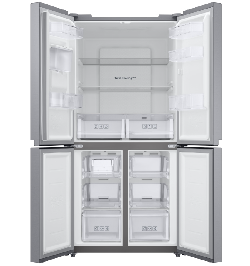 The Samsung Series 8 SpaceMax™ RF48A401EM9 French-Style Fridge Freezer in a sleek Silver finish seamlessly combines modern design with high performance for any contemporary kitchen. With SpaceMax™ technology, this fridge freezer offers extra storage capacity, accommodating up to three more bags of groceries compared to standard models, all while maintaining a compact exterior. The advanced Twin Cooling Plus™ system ensures that optimal humidity levels are maintained throughout, preserving the freshness and quality of your food for longer. The Total No Frost feature prevents ice build-up, saving you the hassle of manual defrosting and making maintenance a breeze.