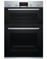 The Bosch MBS533BS0B is a Serie 4 Double Eye Level Oven in Stainless Steel with Soft Open/Close Doors. This Bosch Double Oven has a 71 Litre Multifunction Oven and a 34 Litre Conventional Oven with an Integrated Full Width Grill. There is an easy-to-use Red LED display control to the time functions, and the pop-out controls give the oven a sleek look. The MBS533BS0B benefits from EcoClean Direct, which means less cleaning effort thanks to a special coating covering the lower oven's rear wall.